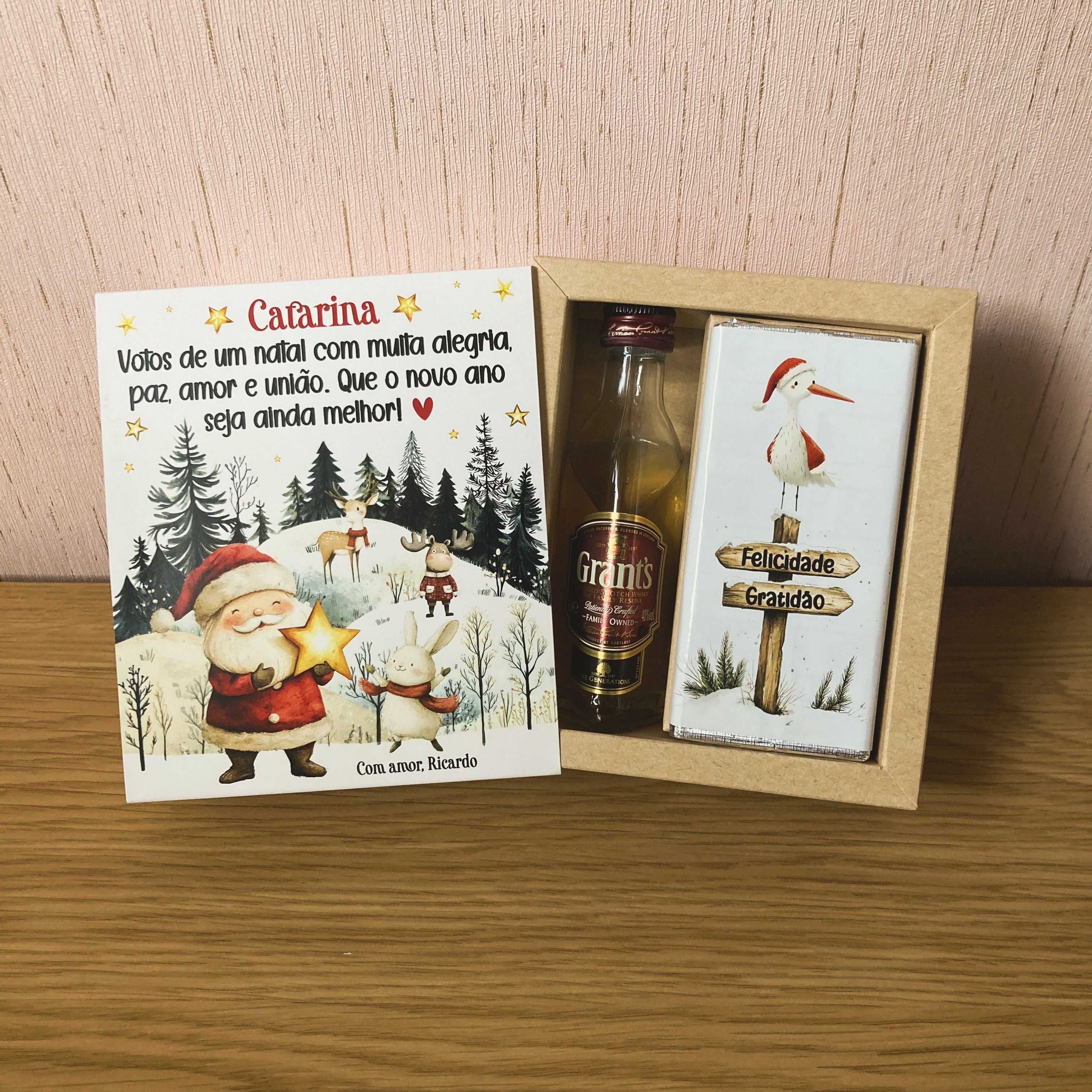 Caixa com uma miniatura 5l e uma tablete de chocolate de 40g. Saborear chocolate e álcool é uma degustação para graúdos e uma experiência de harmonia única e diferente - a Miminhos junta ambos nas nossas caixas mais fofinhas e, sem dúvida, das mais vendidas. Impossível não agradar!